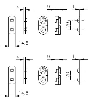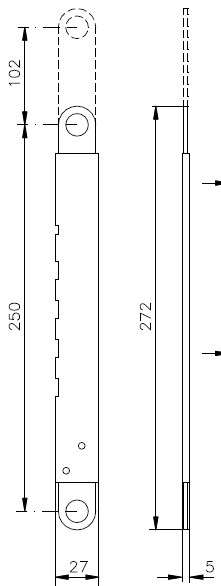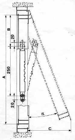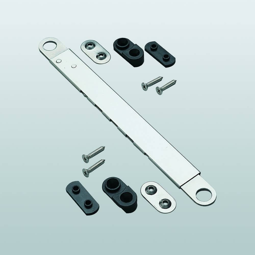 Adjustable multiposition arm for top hung casement opening out, in stainless steel 430, 2 hinge pivots (9 mm) and 2 nylon spacer (4 mm), 4 countersunk head screws Ø 4.8×25 in stainless steel 304. Suitable for profiles with clearance of 21-30 mm. Weight capacity: 2 arms 70 Kg.