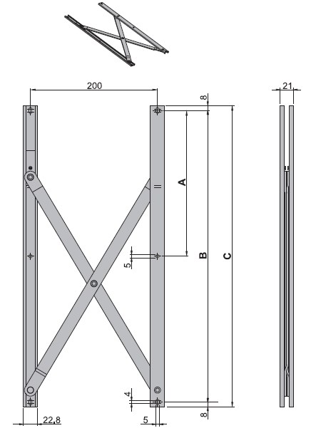 1330PS/20 Couple of parallel opening arms, length of 20” (525 mm), in austenitic (not magnetic) AISI 304 stainless steel, adjustment frictioning grub screw, opening of 200 mm. Weight capacity 55 Kg. Suitable to profiles with clearance >= 21 mm.